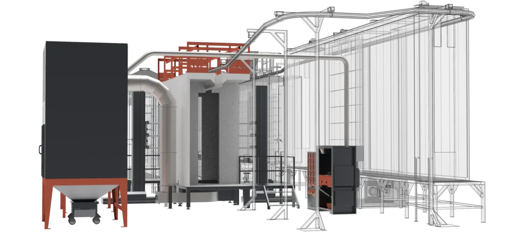 Para minimizar el tiempo y la pérdida de productividad durante el cambio de color, desarrollamos cabinas que se pueden limpiar rápidamente y que ofrecen una alta eficiencia de reciclaje.